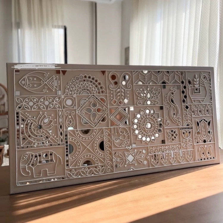 این تابلو با استفاده از خمیر لیپان (Lipan Art Paste) به رنگ شیری و اجرای دقیق تکنیک آینهکاری خلق شده است. بافت لطیف و برجستهی خمیر در کنار انعکاس نور از قطعات آینهی ظریف، جلوهای منحصر به فرد و چشمنواز به تابلو میبخشد.